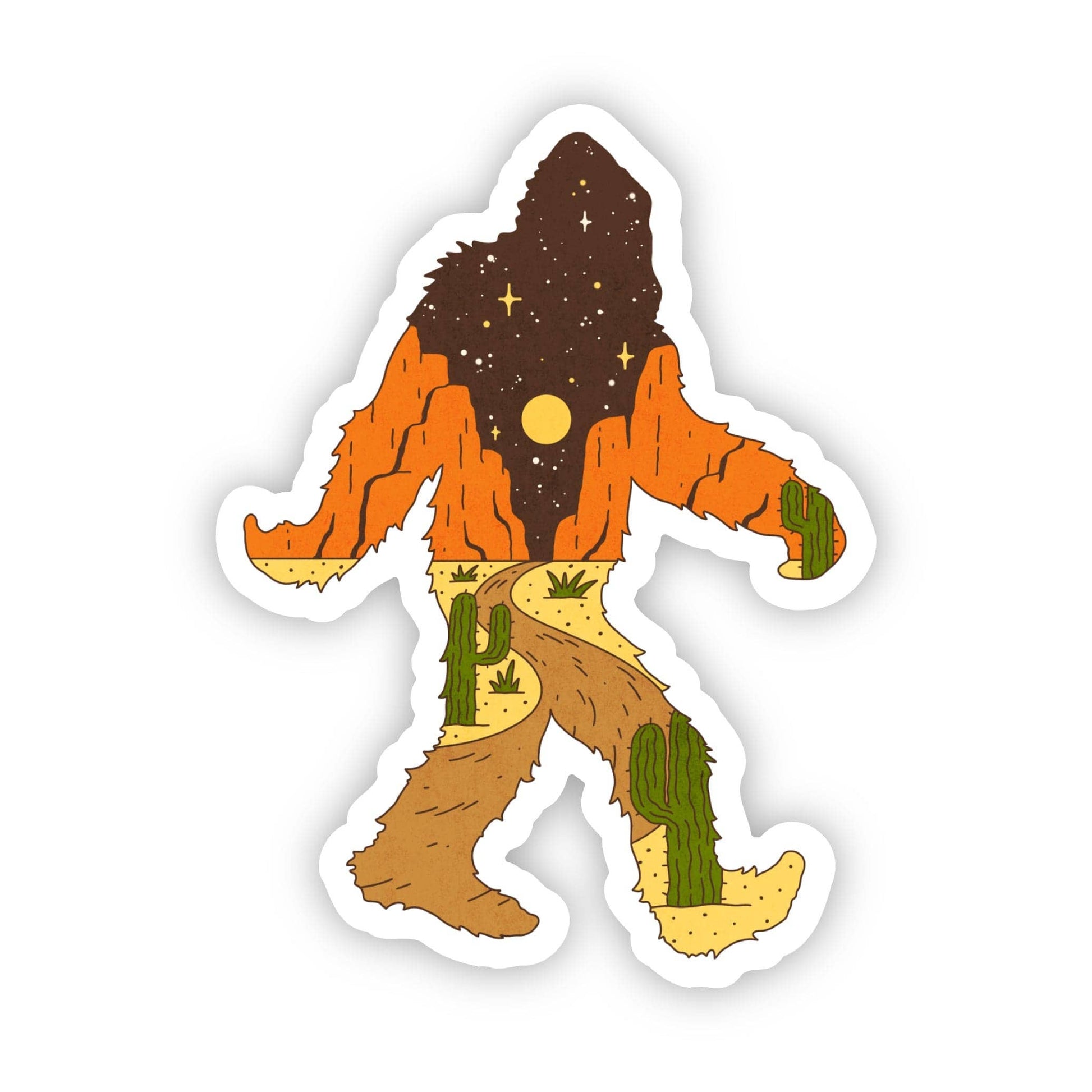 Bigfoot Desert Night Themed Silhouette Sticker. These design includes a southern or western desert, cactus, cliffs, mountains, the night sky, stars, and the moon. High quality vinyl sticker. Great to decorate laptops, water bottles, car windows, coolers, suitcases, bikes, kayaks, phone cases, journals, and more. Details: •2.2" x 3.0" • Printed and shipped with care from the U.S.A. • High quality and durable vinyl, indoor and outdoor use • Waterproof and weather resistant
