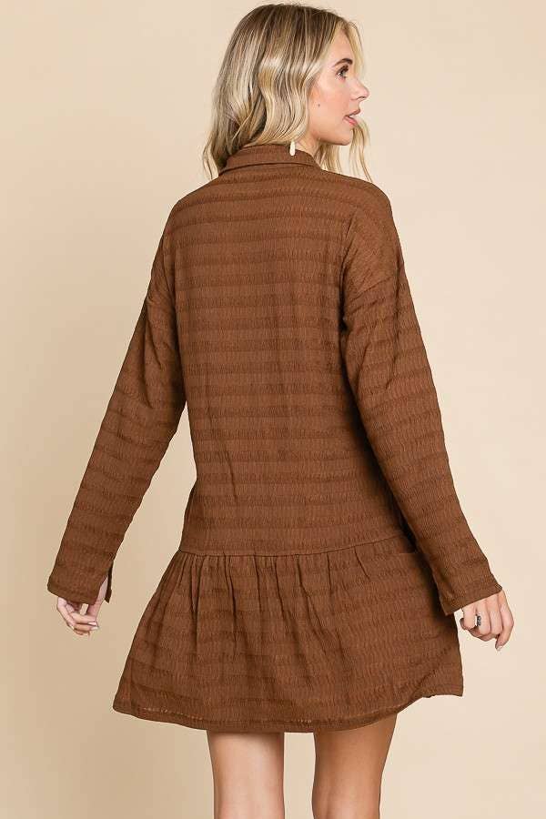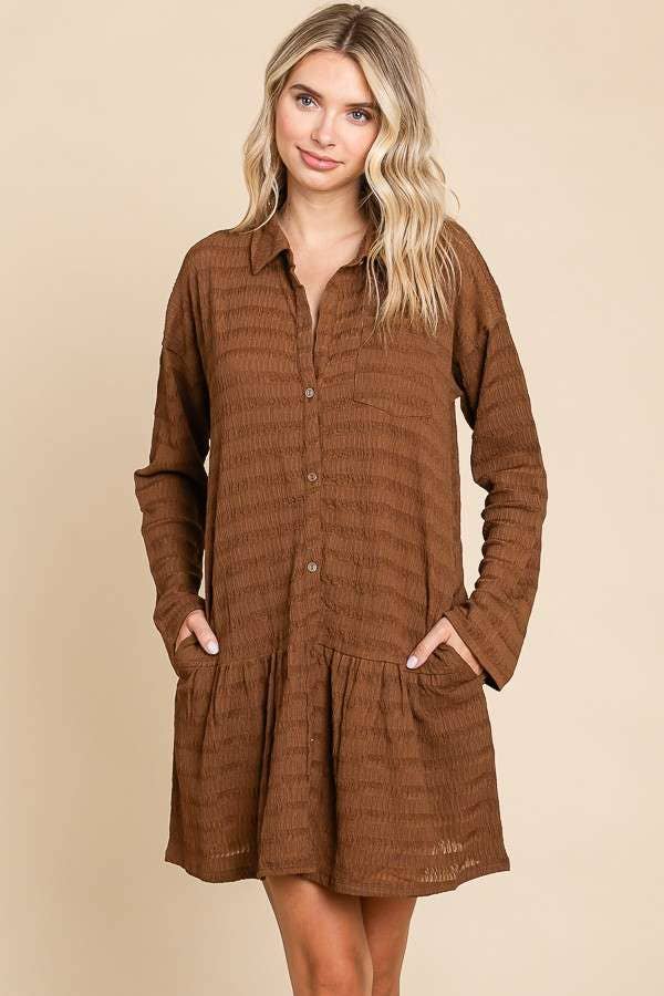 Embrace the cozy vibes of fall with our Autumn Ember Tunic Dress. Stay warm and stylish with its long sleeves and soft, stretchy fabric. The subtle stripe pattern and drop waist add a touch of unique charm to this button-down dress. Perfect for layering during crisp autumn days.