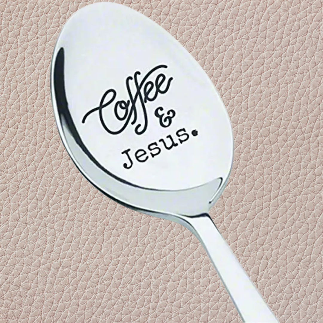 This stainless spoon is engraved with the words "Coffee and Jesus"