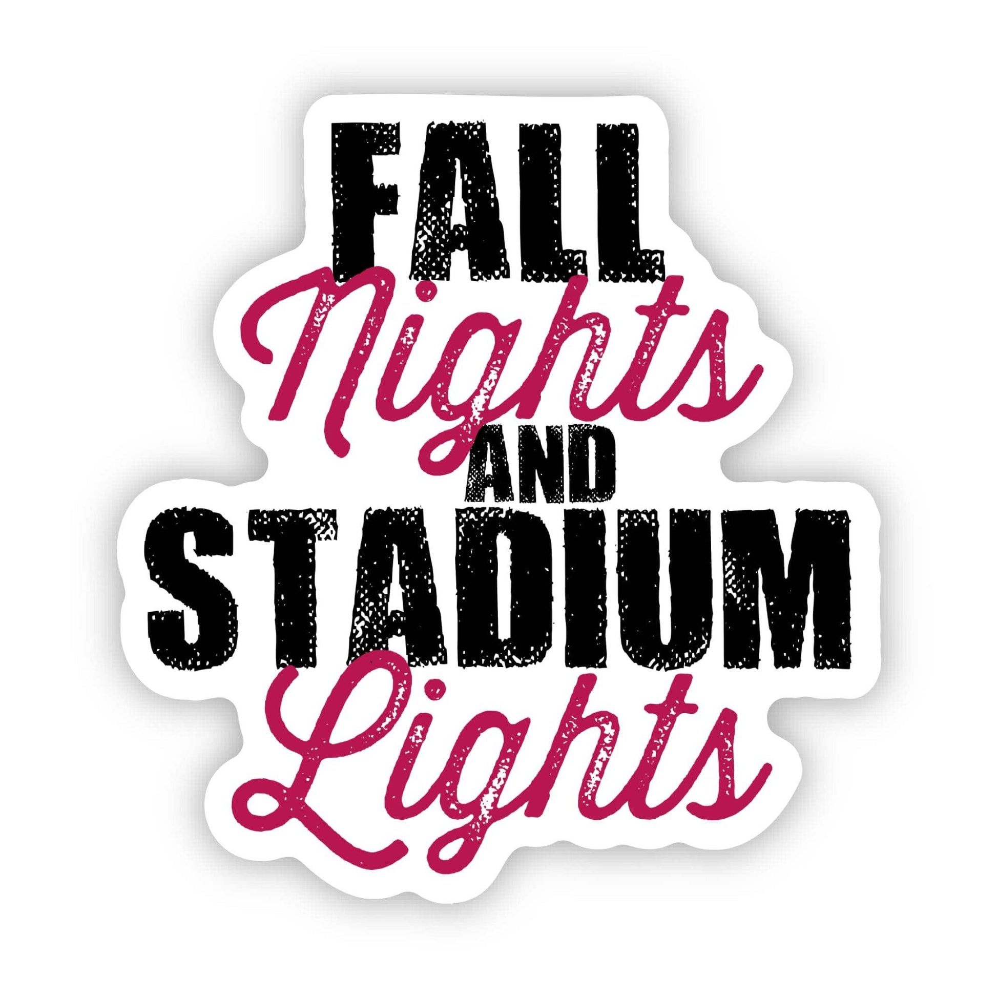 Embrace the excitement for fall football games with our fall nights and stadium lights text sticker. High quality vinyl sticker. Great to decorate laptops, water bottles, car windows, coolers, suitcases, bikes, kayaks, phone cases, journals, and more. Details: • 2.8" x 3" • Printed and shipped with care from the U.S.A. • High quality and durable vinyl, indoor and outdoor use • Waterproof and weather resistant