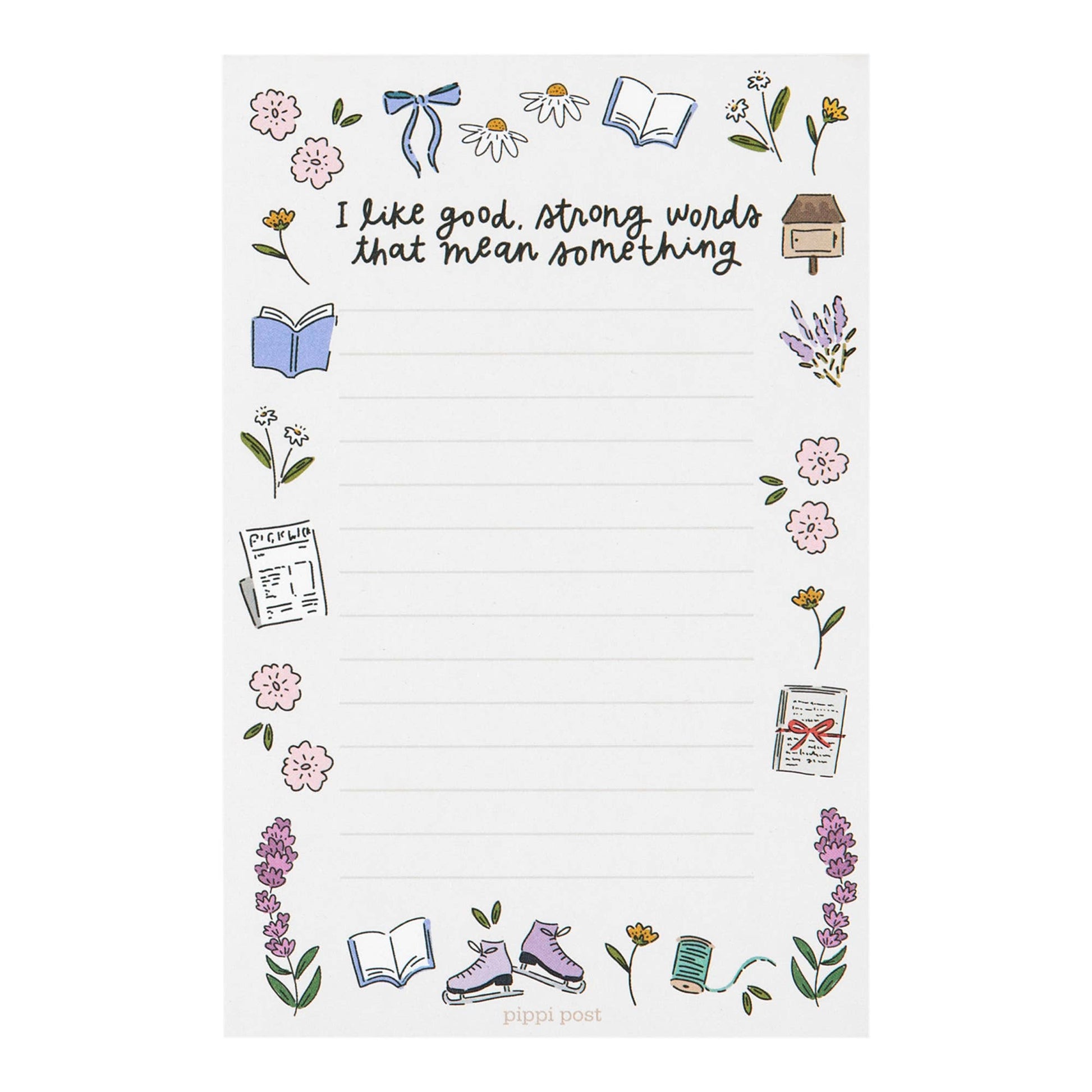 Celebrate your love for Jo March and the timeless words of Little Women with this 4x6 notepad! Featuring the quote, “I like good, strong words that mean something,” this bookish stationery is surrounded by hand-drawn illustrations of books, letters, ice skates, flowers, and a writer’s quill. Perfect for jotting down daily notes, journaling, or gifting to literary lovers, writers, and Little Women fans.