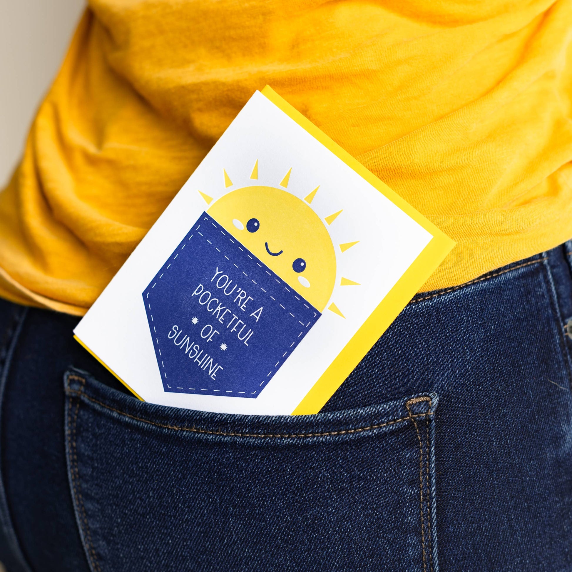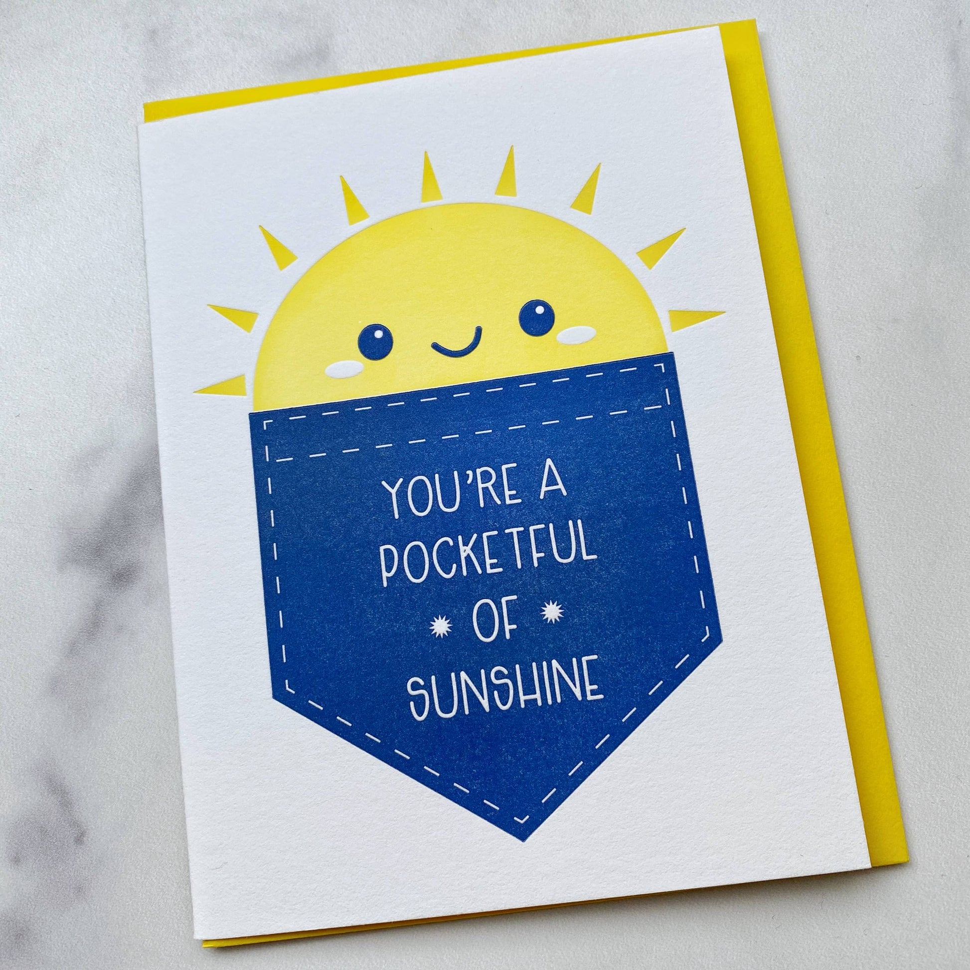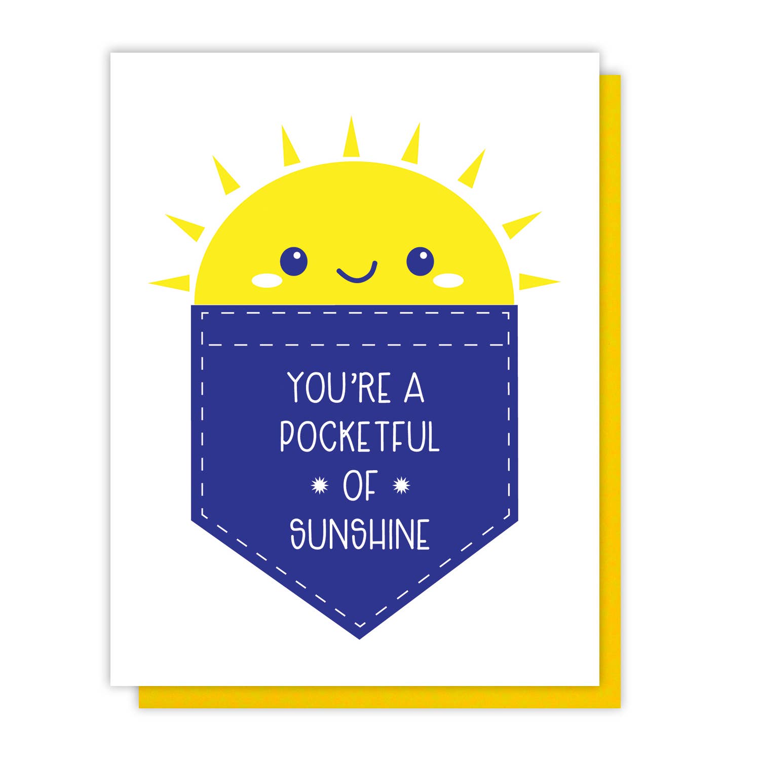 Who doesn't love sunshine and pockets?! Send this card to your favorite person in the world. {size} - A2 {paper} - Printed on Fluorescent White Crane Lettra 110 lb. paper {color} - yellow and denim blue {envelope} - A2 yellow envelope {packaging} - Individually wrapped in a cellophane sleeve Cards are blank inside. All designs © 2010-2022 Kiss and Punch Designs by Julie Stewart. All rights reserved.