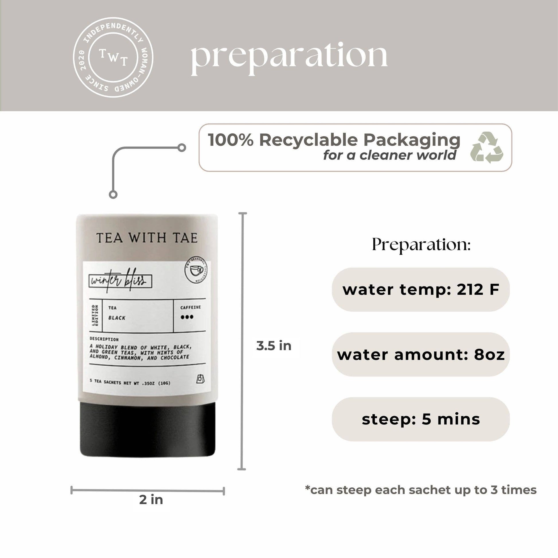 Each mini tea tube is 2” wide and 3.5” tall and is made from 100% recyclable rigid paper tube material. Inside are 5 pyramid tea bags that are made from premium, plastic-free, biodegradable material. Each tea bag holds approximately 2-2.5 grams of whole-leaf tea and herbs. Most customers get at least 2-3 steepings out of each bag. WINTER BLISS ("CHRISTMAS IN A CUP!"): Our most enchanting blend, comprised of three different types of premium whole-leaf teas -- Pai Mu Tan white tea, Ceylon black tea, and Chinese green tea -- blended together with real bits of toasty almonds and coconuts, cinnamon chips, chocolate, and hazelnuts. Our mini tea tubes are perfect small gifts for holidays, Christmas, Black Friday, travel, stocking stuffers, checkout line, grab-and-go options, gift baskets, small tokens of appreciation, Father's Day, back-to-school, teacher gifts, weddings, birthdays, boutique retail shelves, and more.