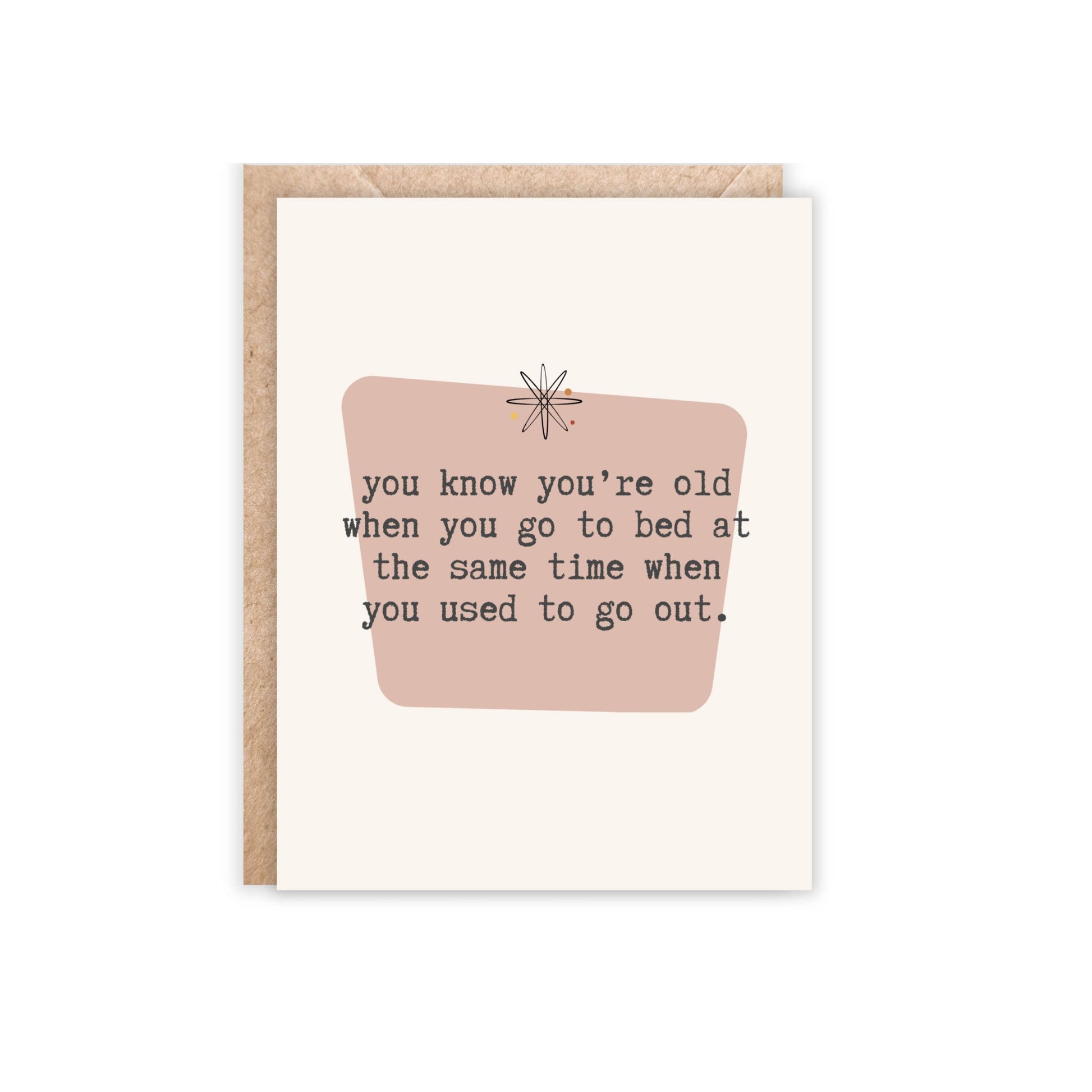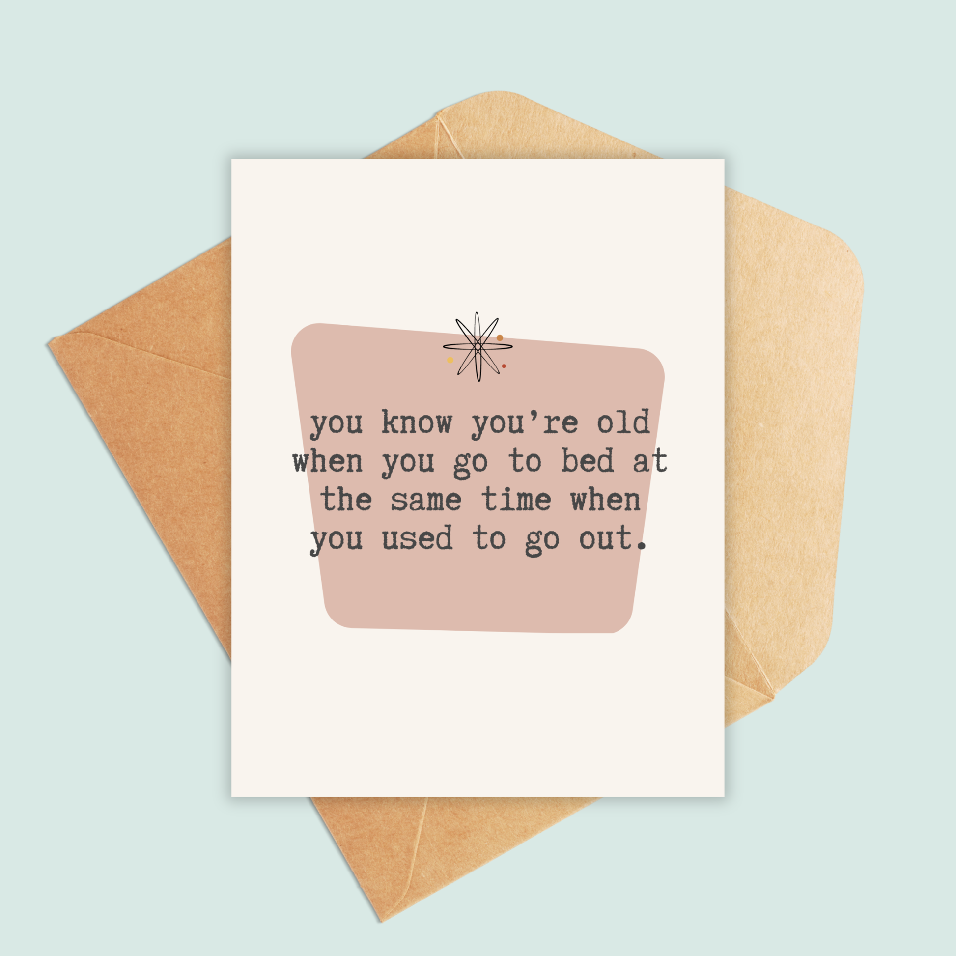 Share a laugh and a nod of recognition with this humorous card that celebrates the inevitable changes that come with age. Perfect for birthdays or just because, send it to someone who can relate to the joys of early bedtime and cozy nights in. After all, a good night's sleep is priceless at any age! OUTSIDE- you know you’re old when you go to bed at the same time when you used to go out. INSIDE- Blank for your own personal message DETAILS: - A2 (4.25" x 5.5") - Printed on 110lb paper - Includes a kraft envelope - Packaged in a protective cellophane sleeve